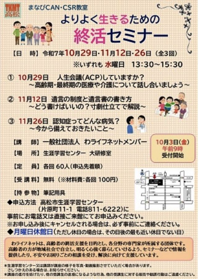 | 令和7年 | 10月29日(水) | 13:30-15:30 | 人生会議(ACP)していますか?~高齢期・最終期の医療や介護について話し合いましょう~ | 香川県立医療大学副学長 片山洋子教授 | まなびCAN(高松市片原町) |